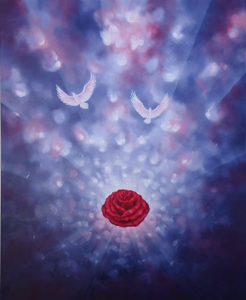 Exploring the mystery of life, through a spiritual quest for freedom while stepping into love, translating her personal journey of meditation and discovery onto canvas.