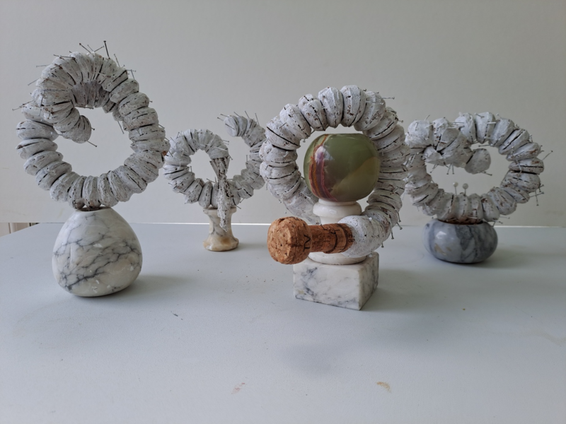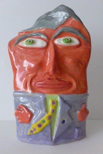 My sculptures are mainly ceramic, but I also use acrylic, gold and silver leaf, liquid gold and silver, resin, paper, and jewellery. My ceramics sculptures have been described as philosophical quirky Pop Art, which are mostly humorous. But some have a more serious theme, reflecting what I think of our spiralling out-of-control world.