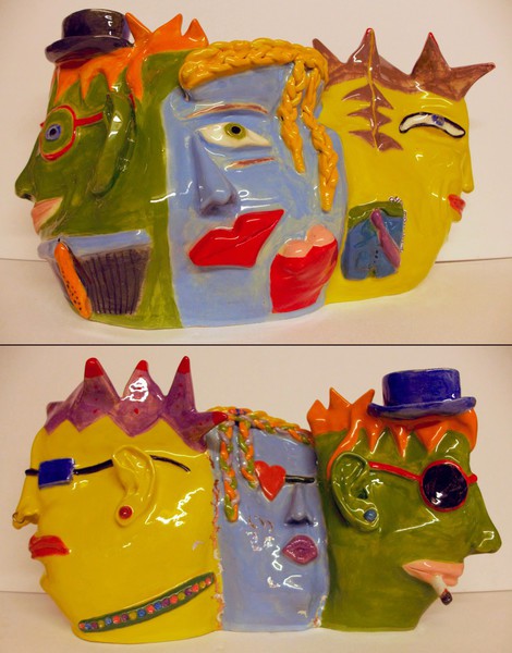Each one of my ceramic sculptures has two sides to it, like a two-page book and each one has a true story behind them. Some of my ideas come from various people I have known over the years, or something that has stuck in my mind that made me laugh.