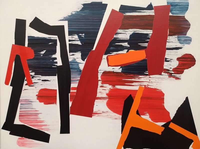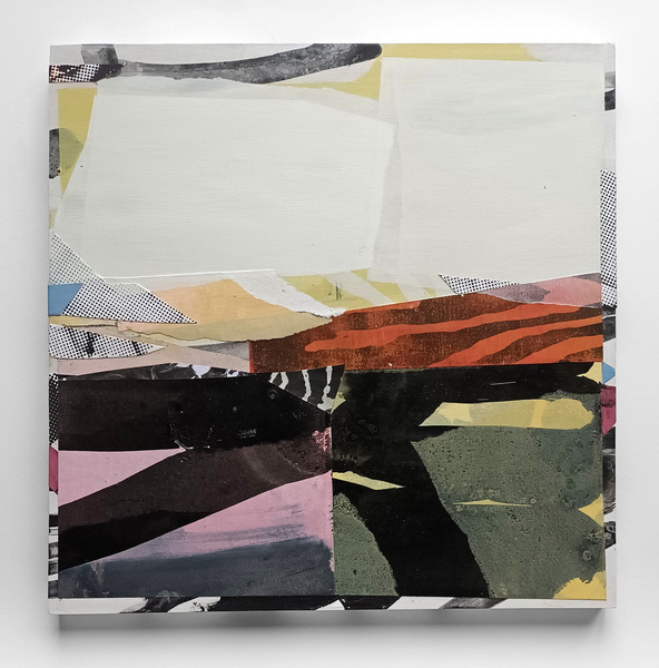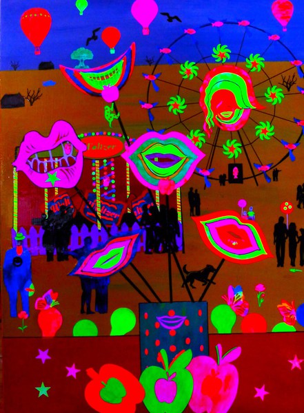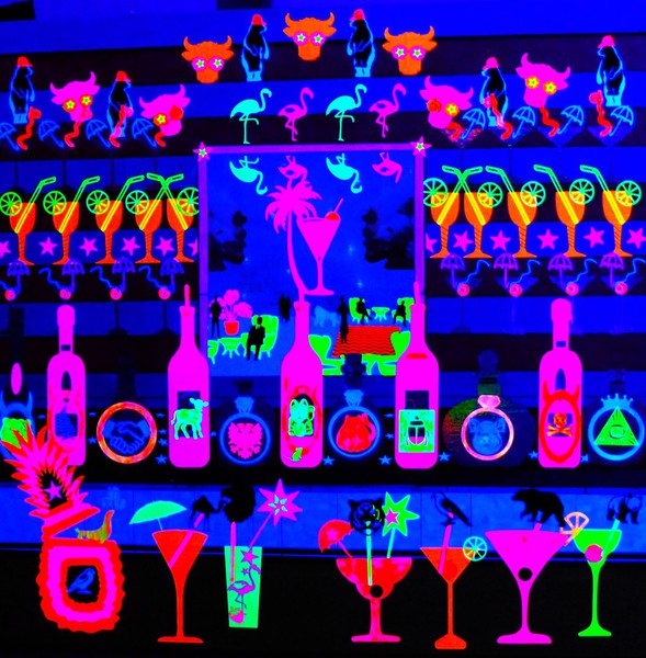 My mixed media collages are made from acrylic paint, coloured fluorescent card, and paint which break down and deteriorates over time. These colours only show up under an ultra-violet light.